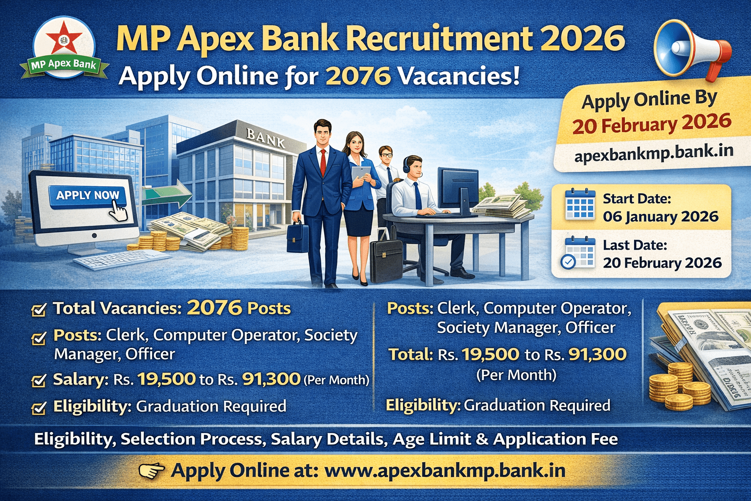| 06-02-2026 | Clerical & Officer Posts | MP Apex Bank | Any Graduate, BCA, B.Com, B.Tech/B.E, M.Sc, MCA | 2076 | 20-02-2026 |