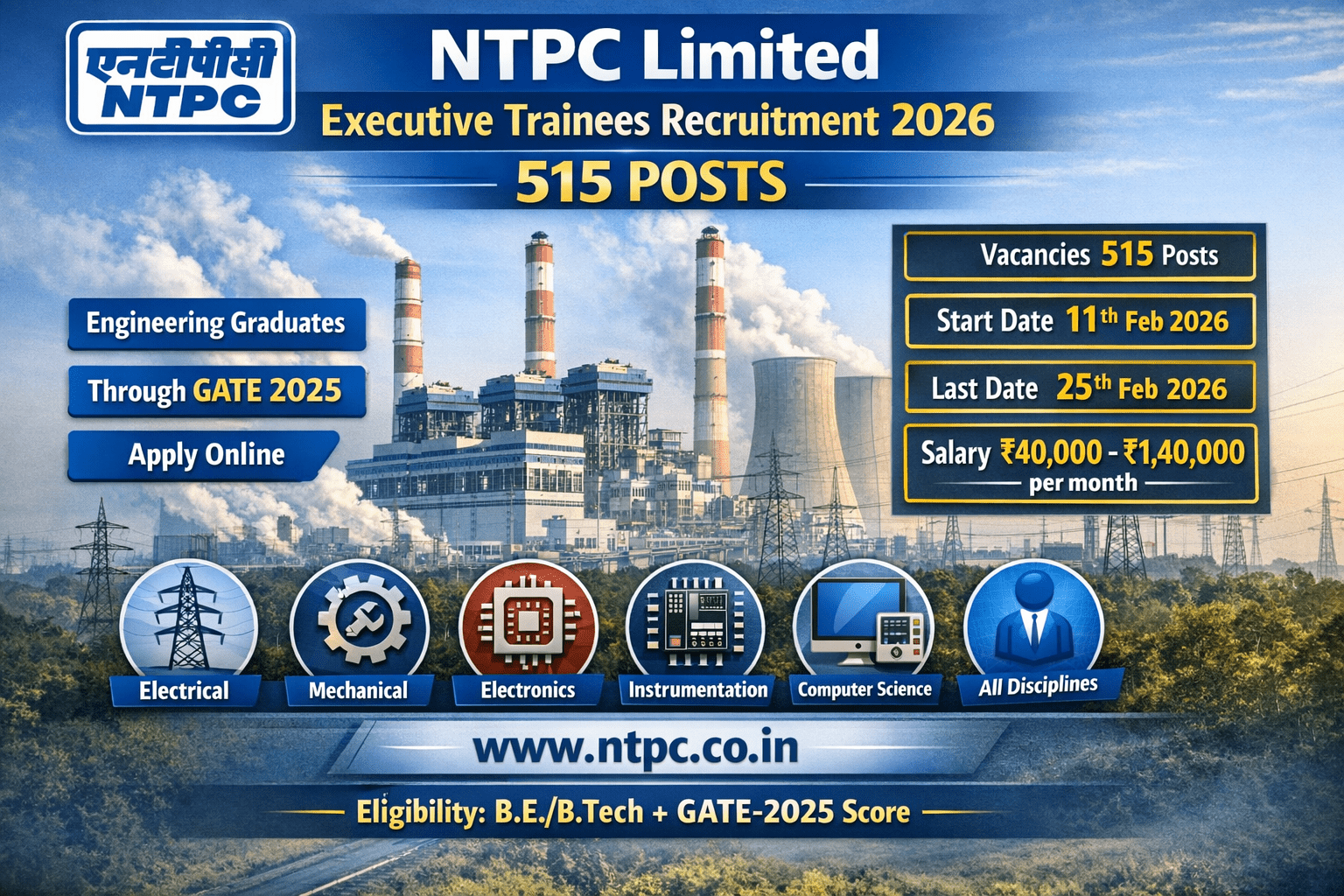 | 11-02-2026 | NTPC Limited Executive Trainees Recruitment 2026 | NTPC | Full-time B.E./B.Tech/B.Sc (Engg) in relevant discipline | 515 | 25-02-2026 |