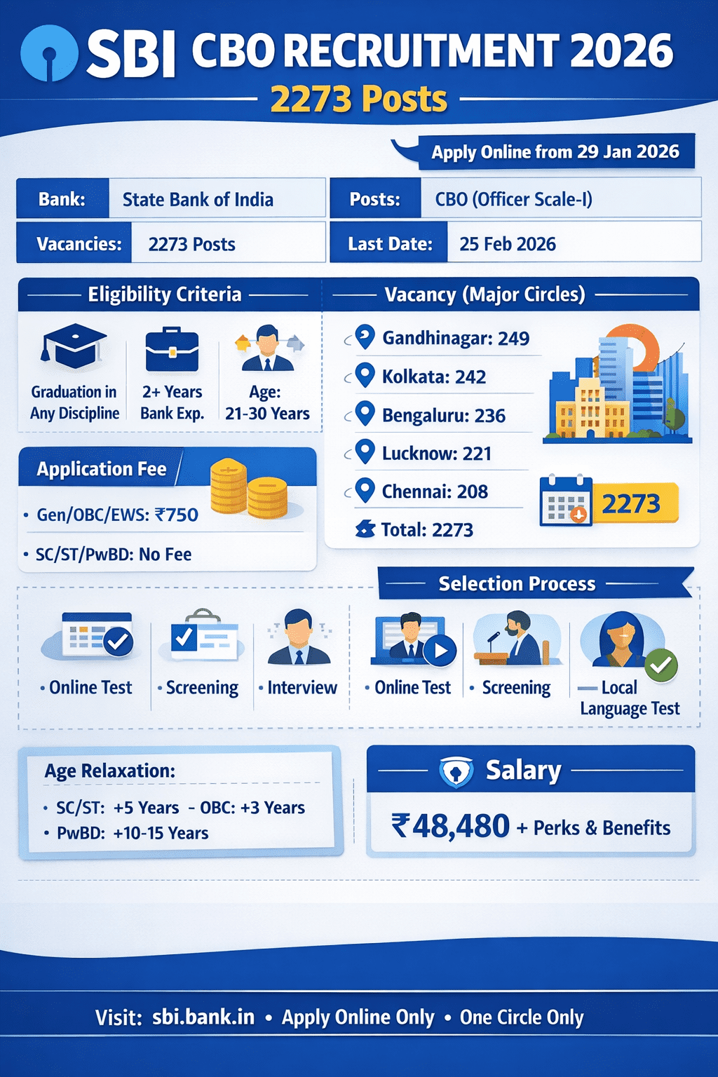 | 11-02-2026 | SBI CBO Recruitment 2026 | SBI | Graduate+2 Years Experience | 2273 | 25-02-2026 |
